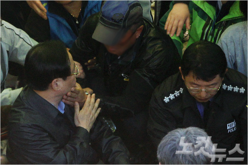 여객선 '세월호' 침몰 사고 아흐레째인 24일 오후 전남 진도군 진도항에서 지지부진한 구조작업에 한 실종자 가족이 이주영 해수부 장관의 얼굴을 잡고 항의하고 있다. 윤성호기자