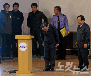 여객선 '세월호' 침몰 사고 16일째인 1일 오후 전남 진도군 실내체육관을 찾은 정홍원 국무총리가 실종자 가족들에게 구조·수색 상황, 대책 등에 대한 이야기를 하기에 앞서 고개 숙여 인사하고 있다. 윤성호기자