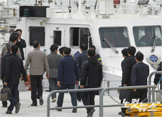 여객선 '세월호' 침몰 사고 19일째인 4일 오후 전남 진도군을 재방문한 박근혜 대통령이 실종자 가족들과 면담을 마친 후 사고해역을 둘러보기 위해 해경 경비정으로 이동하고 있다. (윤성호 기자)
