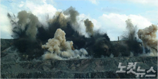 북한 최대 노천광산인 무산광산 발파모습(사진=노동신문)