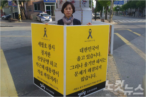정의당 춘천시위원회(위원장 이미숙)가 7일부터 세월호 참사에 대해 박근혜 대통령이 책임질 것을 촉구하는 1인 시위에 돌입했다.