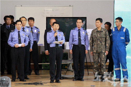 전남 진도군 관매도 인근 해상에서 여객선 세월호가 침몰한지 나흘째인 지난달 19일 진도 실내체육관에서 김석균 해양경찰청장이 민간 및 군 잠수부 등과 구조작업에 대해 설명하고 있다. (윤창원 기자/자료사진)