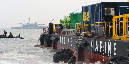 세월호 여객선 침몰 사고 11일째인 지난달 26일 오후 전남 진도군 관매도 인근 사고 해역에 수색작업을 위해 언딘 리베로 바지선이 정박해 있다. (황진환 기자/자료사진)