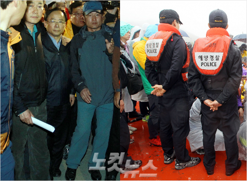 지난달 20일 전남 진도군 팽목항을 방문한 해양수산부 이주영 장관 일행과 28일 기자회견 중인 해경. (자료사진)