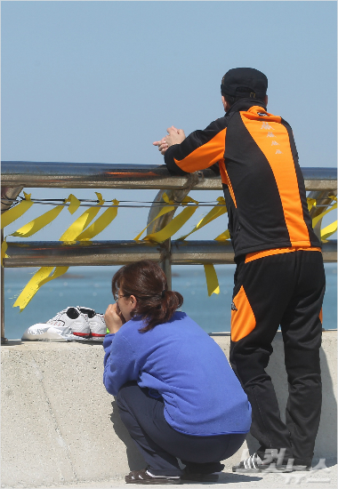 전남 진도군 임회면 남동리 진도항 등대에서 실종자 가족이 허망한 바다를 바라보고 있다. 윤성호기자