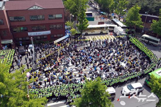 세월호 참사 사망자와 연간 교통사고 사망자 비교 논란과 관련 세월호 참사 유가족들이 9일 오전 청와대 인근 청운동 사무소 앞에서 박근혜 대통령과의 면담과 KBS 사장의 공개사과, 보도국장의 파면 등을 요구하며 연좌농성을 하고 있다.
