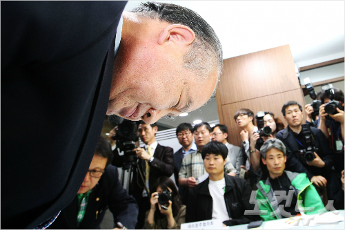 남양유업과 대리점협의회의 첫 단체교섭이 지난해 5월 21일 오후 서울 여의도 국회에서 열렸다. 김웅 남양유업 대표이사가 대표로 참석한 대리점주 앞에서 물의를 일으킨 점에 대해 고개 숙여 사과하고 있다. 윤성호기자
