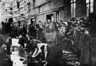 빈의 거리에 끌려나와 칫솔로 바닥 청소를 하는 유태인들.