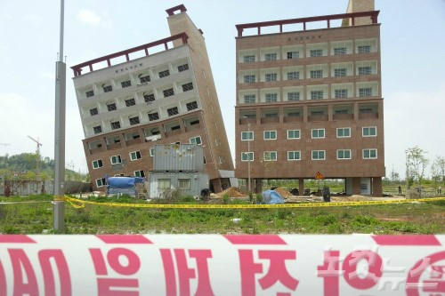 건물 안에 사람이 없었길래 망정이지 사진을 보면 얼마나 부실하게 지었길래 저렇게까지 건물이 기울어질 수 있을까 싶을 정도라 안에 들어가 살라고 지은 게 아니라 마치 죽으라고 지은 것 같습니다.
