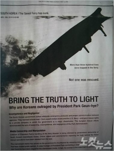 ◈ 뉴욕 타임즈에 실린 세월호 관련 광고에 새누리당 '화들짝'현지 시간으로 지난 11일 일요일자 뉴욕타임즈 19면에 전면광고가 실렸는데요.