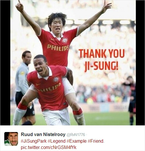 판 니스텔루이는 14일 자신의 트위터에 PSV 에인트호번 구단이 게재한 박지성의 사진을 올렸다. 더불어 해쉬태그를 통해 '박지성(JiSungPark), 전설(Legend), 귀감(Example), 친구(Friend)'라는 메시지를 남겼다.