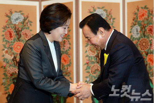 11일 오전 국회 사랑재에서 이완구, 박영선(좌측) 여야 신임 원내대표가 첫 공개회동을 가지며 악수를 하고 있다. (사진=윤창원 기자)