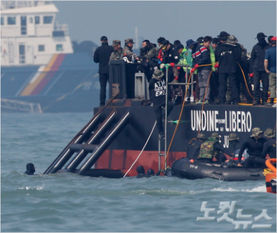 여객선 '세월호' 침몰 사고 아흐레째인 24일 오전 전남 진도군 관매도 인근 사고현장에서 해군과 해양경찰, 민간 잠수사 등 구조대원들이 구조작업을 하고 있다. 윤성호기자