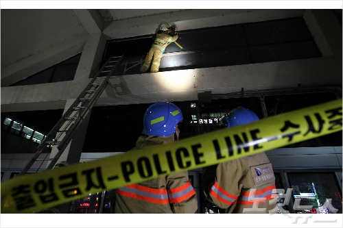 지난 19일 오후 7시께 경기 군포시 금정동 지하철 4호선 상행선 금정역 전동차 상부에 있던 절기절연장치가 폭발음과 함께 파손되는 사고가 발생, 출동한 소방관들이 남아 있는 유리 파편을 제거하고 있다. 박종민기자/자료사진