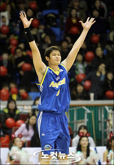 19일 오후 잠실 학생체육관에서 벌어진 프로농구 2007/2008 프로농구 SK 나이츠와 삼성 썬더스의 경기에서 삼성 이규섭이 승리를 확신하는 3점 슛을 성공한 뒤 코트에서 두 손을 번쩍 들어보이고 있다.