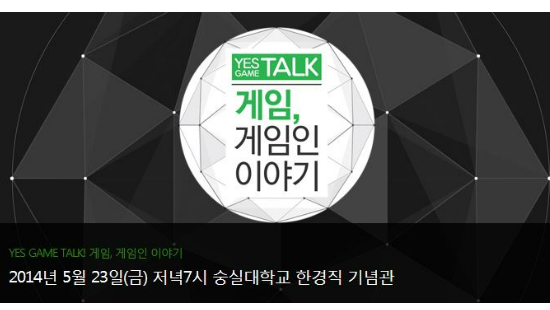 한국게임학회와 CJ E&M의 게임전문채널 온게임넷이 공동 주최하는 토크콘서트 'Yes Game Talk : 게임, 게임인 이야기'가 23일 오후 7시부터 숭실대 한경직기념관에서 열린다.