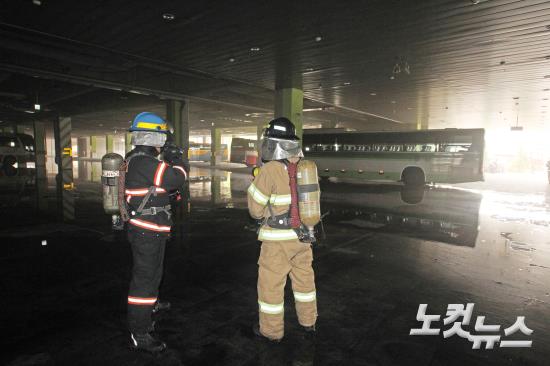 26일 오전 9시 1분쯤 경기도 고양시 일산동구 백석동 고양시외종합터미널 내 지하 1층 CJ푸드빌 공사현장에서 화재가 발생한 가운데 사고현장에서 긴급 출동한 소방대원들이 분주한 모습을 보이고 있다. 이번 화재로 사망자 6명과 부상자 24명이 발생했다.