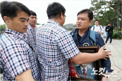 26일 오전 9시 30분쯤 청와대 분수대 앞. 경찰 10여 명과 시민 유동환(46) 씨가 대치하고 있다. 유 씨의 손에는 고인이 된 아버지 유한숙 씨의 영정사진이 들려있었다.