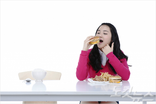 고칼로리 음식을 먹고 있는 모습.
