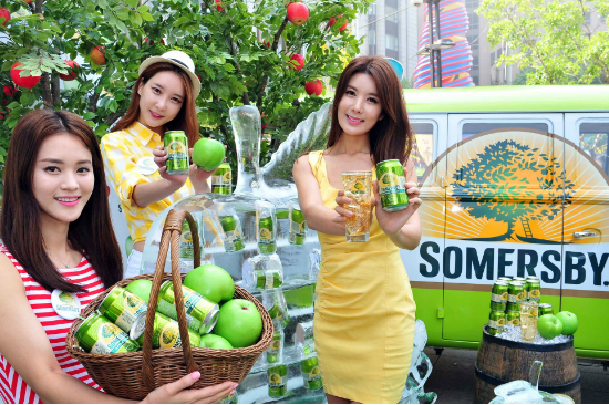 애플사이더 써머스비 모델들이 29일 서울 광화문 청계광장에서 '써머스비(Somersby)' 캔을 선보이고 있다. 피크닉·캠핑 등 야외에서 간편하게 즐길 수 있도록 이번에 새로 캔 제품이 출시됐다. 써머스비는 사과를 발효해 만든 알코올 도수 4.5%인 주류제품으로 판매가격은 3200원(편의점가 기준, 330㎖)이다. 얼음과 함께 즐기면 스파클링의 톡 쏘는 시원함과 사과의 상큼한 맛이 어우러져 와인이나 샴페인 대용으로 안성맞춤이다. /사진제공=써머스비