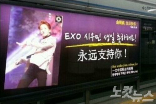 한국 지하철에 수천만원 들여 엑소 멤버 생일축하광고 싣기도차세대 한류 아이돌 그룹으로 중국 내에서 많은 인기를 얻고 있는 그룹 엑소(EXO)도 중국 팬들의 특이한 선물이 화제다. 중국 한류 팬들은 수 백 만원에 이르는 고가의 지하철이나 버스 광고를 통해 멤버의 생일을 축하하는 광고를 싣는 것으로 유명하다.