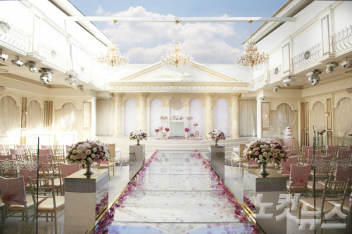 ◈ 화려한 핑크 빛 버진로드가 인상적인 '아이리스홀'라루체 아이리스홀은 은은한 아이보리 빛을 띤 고대 그리스의 아테네 신전을 모티브로 설계됐다. 천정에 광섬유를 사용해 은은하게 아래로 떨어지는 빛을 표현함으로써 신비로운 느낌이 한껏 돋보이게 설계된 극장식 복층형 구조의 홀이다.
