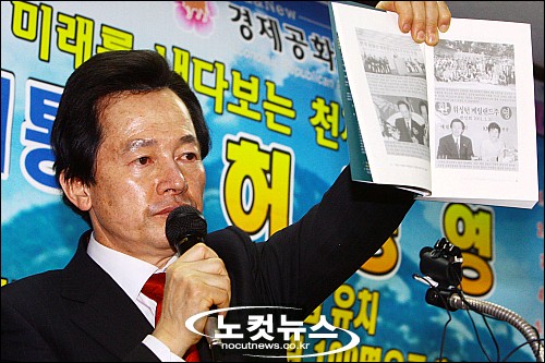 지난해 대선에서 튀는 공약과 발언으로 주목받아 온 허경영씨(58·경제공화당)에 대해 검찰이 사전구속영장을 청구하기로 한 가운데 21일 오후 서울 영등포 사무실에서 허경영씨가 기자회견을 갖고 그 동안의 의혹에 대해 해명하고 있다. 책의 오른쪽 아래가 박근혜 전 대표와 찍은 사진.