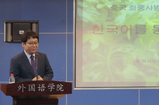 경희사이버대학교 한국어문화학과 김지형 교수가 지난 30일 중국 화중사범대학교에서 '한국어를 통해 본 한국문화'를 주제로 특강을 진행하고 있다.