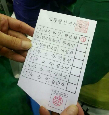 사진 속에는 지난 2012년 대선에 쓰인 것으로 보이는 투표용지가 보이고, 당시 새누리당 후보였던 박근혜 대통령의 이름 옆에 도장이 찍혀 있다.