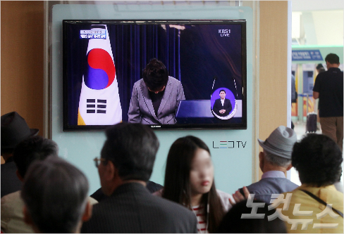 지난달 19일 오전 서울역에서 시민들이 TV를 통해 세월호 참사에 관한 박근혜 대통령 대국민담화 발표를 시청하고 있다. 윤성호기자