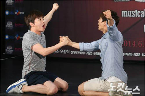 배우 조정석과 장승조가 9일 오후 서울 연건동 홍익대 대학로 아트센터 연습실에서 진행된 뮤지컬 ‘블러드 브라더스’ 공개연습에서 열연을 펼치고 있다. 사진=황진환 기자