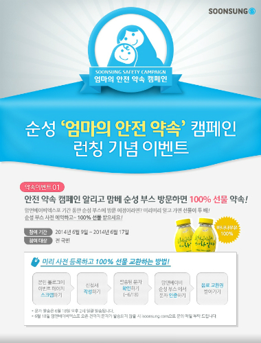 이번 캠페인은 오는 19일 일산 킨텍스에서 개최하는 맘앤베이비 엑스포의 순성 부스(제1전시장, L1)에서 론칭 행사를 진행할 예정이며, 이를 기념해 9일부터 17일까지 무료 음료 교환권을 증정하는 사전 이벤트를 진행한다.