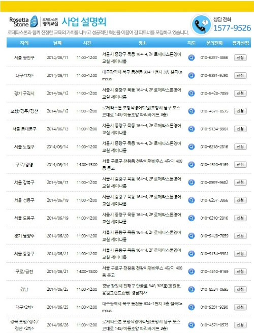 사업설명회에 참여가 어렵거나, 그 밖에 로제타스톤 영어교실 창업 및 학습에 대한 문의사항이 있을 경우에는 대표전화 1577-9526을 통해 별도의 상담을 받을 수도 있다.