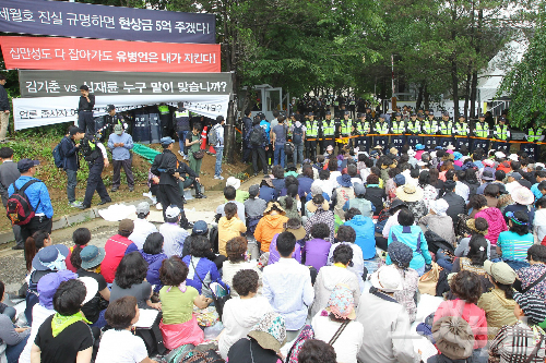 금수원에 대한 압수수색이 실시된 11일 오전 경기도 안성시 보개면 금수원 정문 앞에 금수원 내로 진입하지 못한 구원파 신도들이 모여 있다. 검경은 이날 오전 구원파 측에 금수원에 대한 압수수색 및 체포영장 집행사실을 통보한 뒤 오전 8시10분께부터 공권력을 투입, 이른바 '두 엄마 체포작전'에 돌입했다. (사진=박종민 기자)