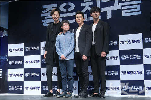 영화 '좋은 친구들' 제작보고회가 12일 오전 서울 신사동 압구정 CGV에서 열린 가운데 (왼쪽부터) 배우 이광수, 이도윤 감독, 지성, 주지훈이 포토타임을 갖고 있다.