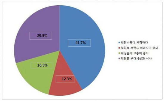 이에 총 732명이 설문에 응답 했는데 "웨딩비용이 저렴하다"가 41.7%, "웨딩홀 부대시설과 식사"가 29.5%, "웨딩홀 교통이 좋다"가 16.5%, "웨딩홀 브랜드 이미지가 좋다"가 12.3% 순으로 나타났다.