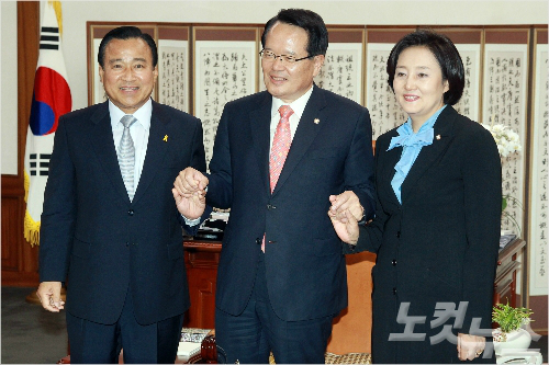 정의화 국회의장과 새누리당 이완구, 새정치민주연합 박영선 원내대표가 12일 오후 국회 의장실에서 회동을 하고 있는 모습. 17일 회동에는 이 원내대표가 참석하지 않았다. (사진=윤창원 기자)