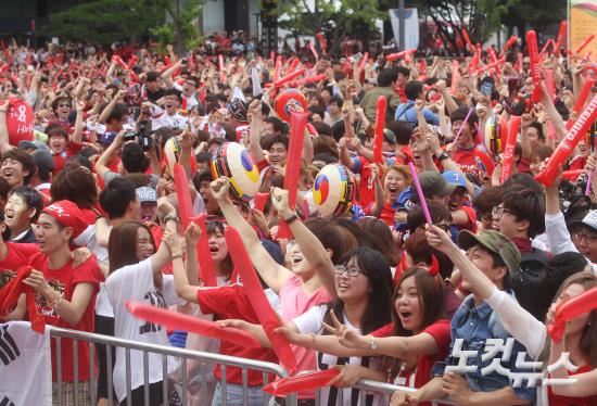 '2014 브라질 월드컵' H조 한국 대 러시아의 예선경기가 열린 18일 오전 서울 세종로 광화문광장에서 펼쳐진 거리응원전에서 대한민국이 선취골을 성공시키자 시민들이 열광하고 있다.