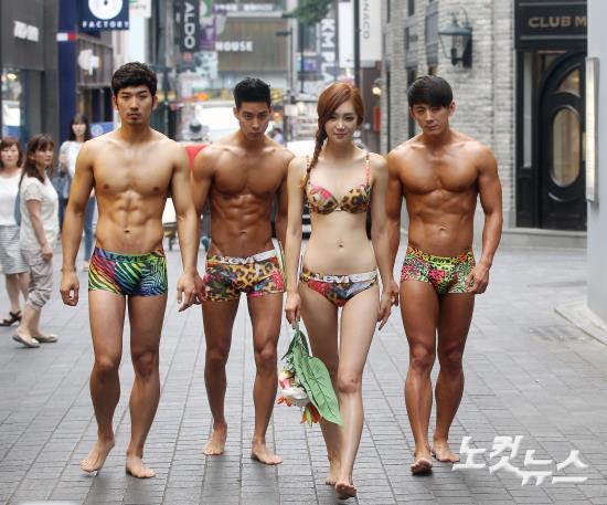 언더웨어 '리바이스 바디웨어'가 19일 오전 서울 중구 리바이스 바디웨어 명동점에서 '바캉스 속옷 미니 패션쇼'를 진행했다. '2014 맨즈헬스 쿨가이 선발대회' 우승 후보자들과 여성 모델이 워킹을 선보이고 있다.