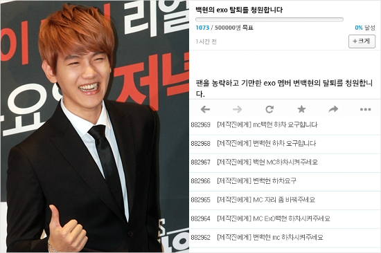 게시자는 "팬을 농락하고 기만한 엑소 멤버 백현의 탈퇴를 청원한다"라며 서명을 촉구했다. 현재 이 청원글은 삭제됐지만, 1,800명 가량의 네티즌들이 해당 청원에 서명했다.