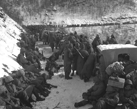 중공군의 포위망을 뚫고 장진호 서쪽에서부터 흥남으로 후퇴하고 있는 미 해병 1사단의 5연대와 7사단 장병들