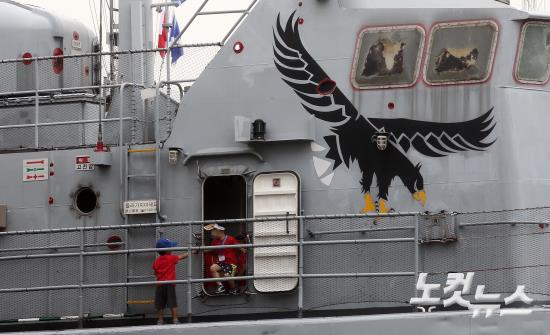 6.25 전쟁 64주년인 25일 서울 용산구 전쟁기념관을 찾은 어린이들이 연평해전 당시 전투에 참가한 참수리호를 관람하고 있다.