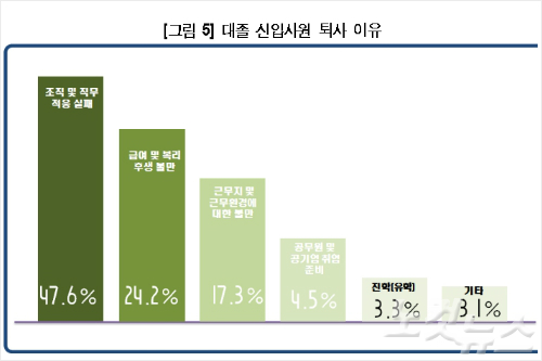 신입사원들의 퇴사 이유는 '조직 및 직무적응 실패'(47.6%)가 가장 많았고, 이어 '급여 및 복리후생 불만'(24.2%), 근무지역 및 근무환경에 대한 불만(17.3%) 순이었다.