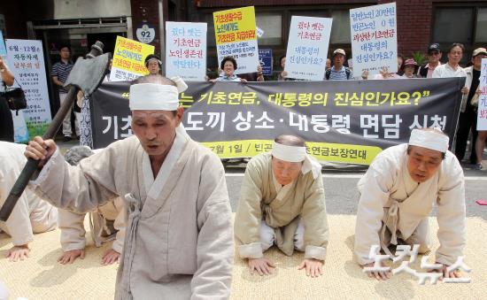 기초연금에서 배제된 노인들이 노비 옷을 입고 1일 오전 서울 청운효자동주민센터 앞에서 열린 '기초연금에서 배제된 빈곤노인, 대통령 도끼상소 기자회견'에서 국민기초생활법 시행령을 개정해 기초연금을 장애연금과 보육수당처럼 소득으로 보지 않도록 요구하며 도끼로 목을 내려치는 퍼포먼스를 하고 있다.