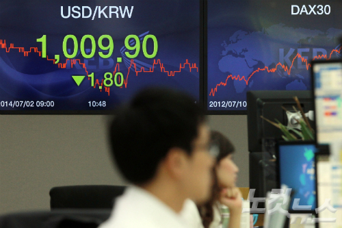 원·달러 환율 장중 1,010원선이 붕괴된 2일 오전 서울 명동 외환은행 본점 딜링룸에서 딜러들이 업무를 하고 있다. 원·달러 환율이 1,010원선이 붕괴된 것은 글로벌 금융위기 이전인 2008년 이후 6년 만이다. (사진=황진환 기자)