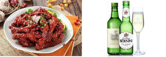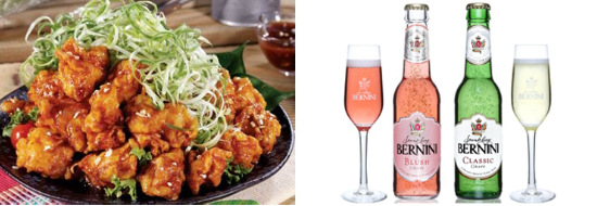 매콤한 양념 파닭을 먹다 보면 코 끝이 찡하게 올라오는 파의 아린 맛을 느낄 수 있다. 이 아린 맛을 달랠 수 있는 주류는 달콤한 스파클링 와인이다. 모스카토 품종으로 만들어진 버니니는 달콤한 첫 맛과 미세한 기포가 입안에 감돌며 조화를 이룬다. 파의 알싸한 맛이 느껴질 때 한 모금 마시면 그 맛을 중화시켜주며, 개운한 느낌까지 든다.