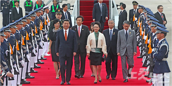 한국을 첫 국빈방문한 시진핑 중국 국가주석과 부인 펑리위안이 3일 오후 서울공항을 통해 입국하고 있다. 시 주석의 이번 방한은 지난해 박근혜 대통령의 중국 방문에 대한 답방으로 북한 및 일본 방문보다 먼저 이뤄지는 것이어서 관심이 쏠리고 있다. 중국 국가주석의 한국 국빈방문은 1995년 11월 장쩌민 주석과 2005년 11월, 2008년 8월의 후진타오 주석에 이어 네번째다.
