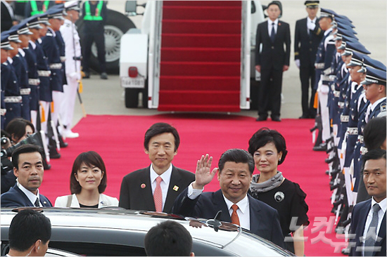 한국을 첫 국빈방문한 시진핑 중국 국가주석이 3일 오후 서울공항을 통해 입국하고 있다. 시 주석의 이번 방한은 지난해 박근혜 대통령의 중국 방문에 대한 답방으로 북한 및 일본 방문보다 먼저 이뤄지는 것이어서 관심이 쏠리고 있다. 중국 국가주석의 한국 국빈방문은 1995년 11월 장쩌민 주석과 2005년 11월, 2008년 8월의 후진타오 주석에 이어 네번째다.