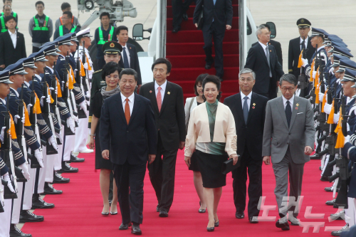 한국을 첫 국빈방문한 시진핑 중국 국가주석이 3일 오후 서울공항을 통해 부인 펑리위안 여사와 함께 입국하고 있다. (사진=윤성호 기자)