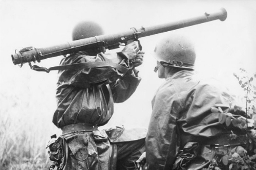 인민군 탱크를 향해 스미스 부대원들이 바주카포를 쏘고 있다.